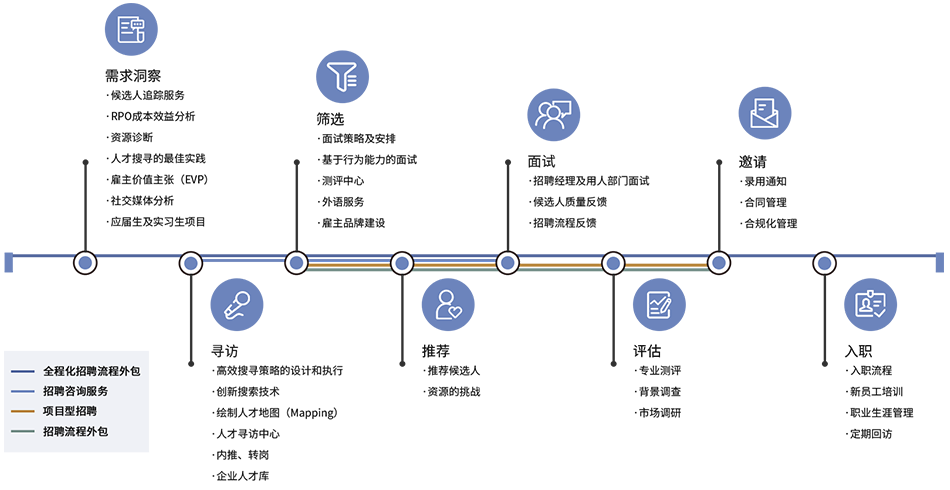 有針對性地提供部分或全流程招聘外包服務(wù)。作為一家專業(yè)的招聘流程外包服務(wù)商,我們旨在整合戰(zhàn)略、技術(shù)、資源及供應(yīng)商管理,以提供高效招聘流程服務(wù)。在服務(wù)過程中,我們將作為企業(yè)戰(zhàn)略合作伙伴與你的內(nèi)部團隊緊密合作,通過流程設(shè)計、制定招聘戰(zhàn)略、人才尋訪、人才選拔、招聘決策、辦理入職、技術(shù)協(xié)調(diào)及核心業(yè)務(wù)數(shù)據(jù)的匯報等服務(wù),幫助企業(yè)提升招聘效率,提高招聘質(zhì)量,同時降低招聘成本。